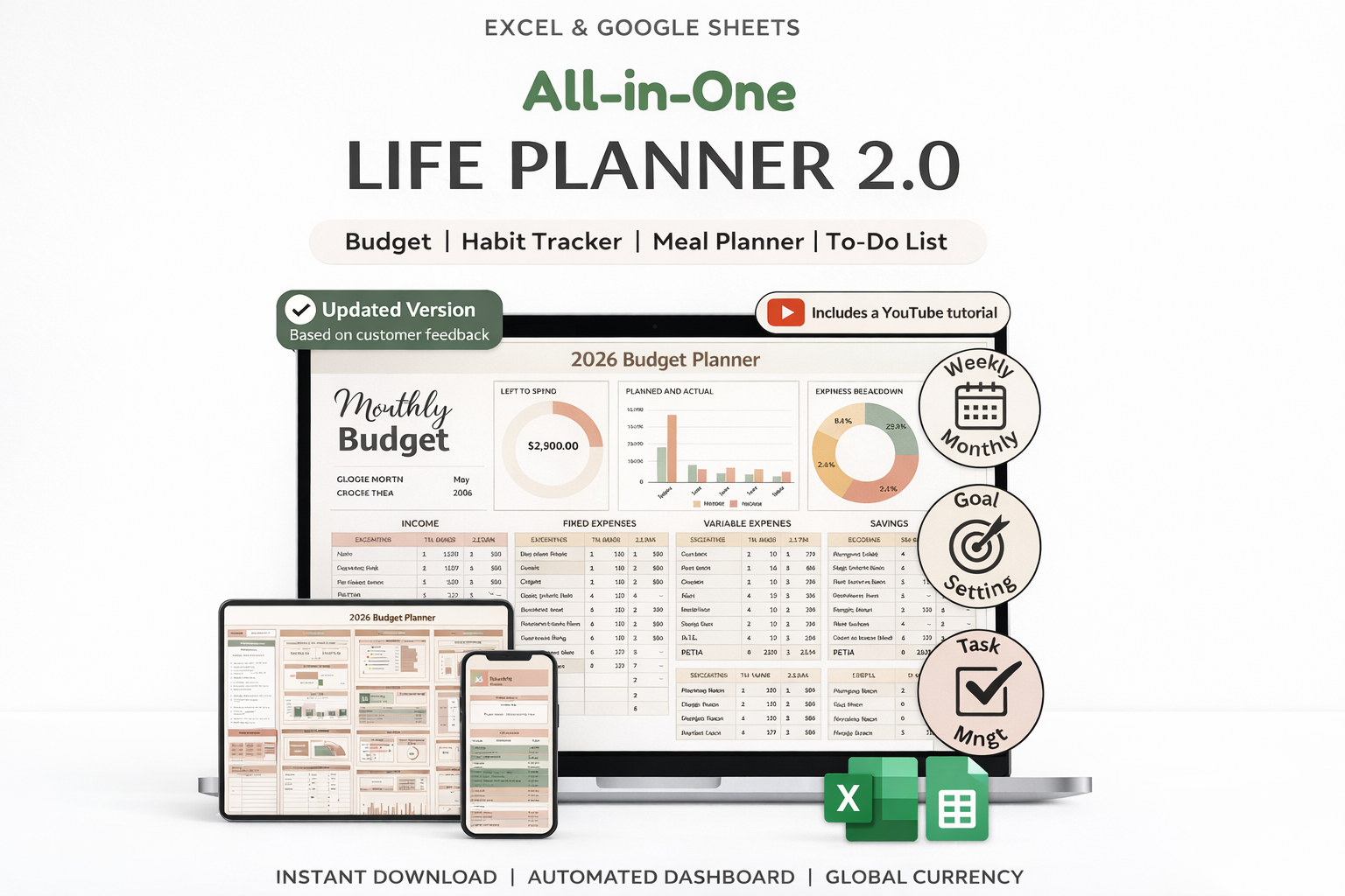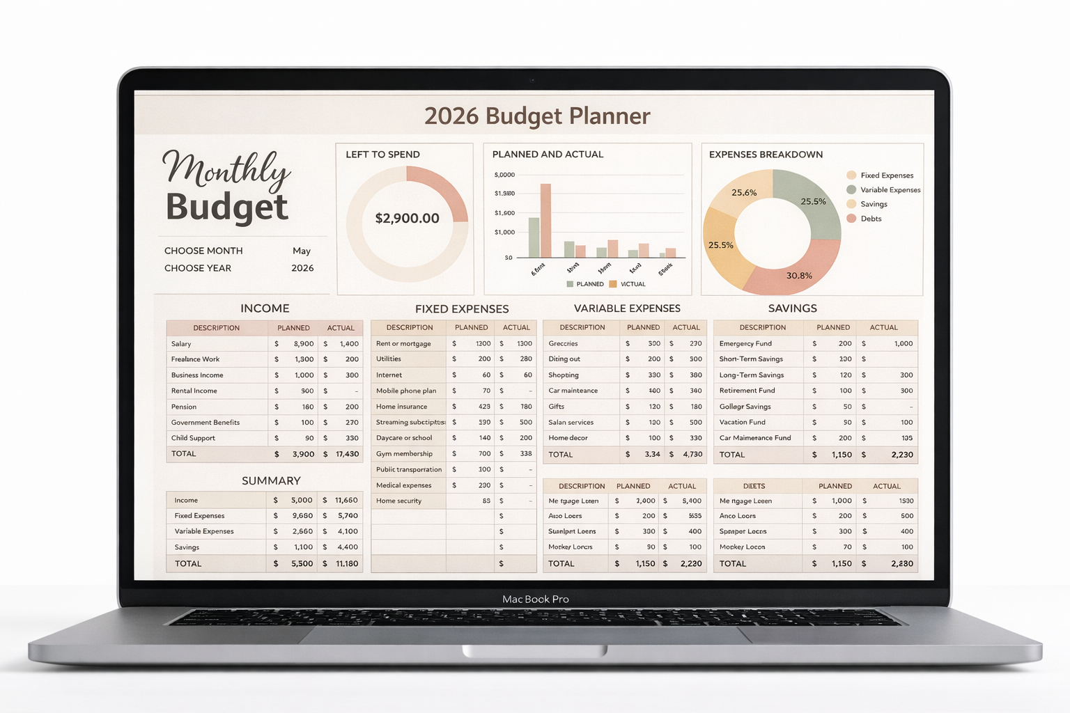 Built-in formulas and charts provide access to all key budget information. Enter your monthly income or expense amount on a separate sheet, and our template will do the rest. Evaluate your income, fixed, and variable expenses, while bar and pie charts show remaining funds, planned and actual income/expenses, and expense breakdowns by category.